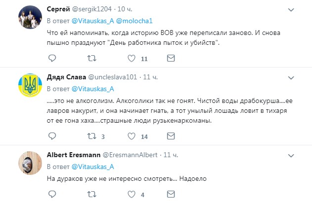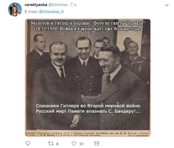 В свою очередь слова Захаровой были высмеяны в сети. Комментаторы напомнили ей о массовых убийствах, которые совершали сотрудники НКВД на западной Украине и сотрудничестве советской власти с Гитлером.