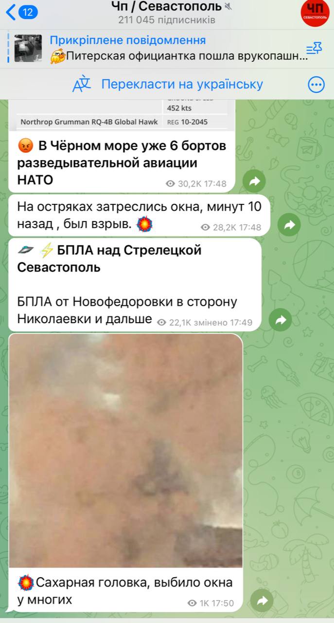 Тем временем пророссийские паблики рапортуют, что в районе Севастополя была сбита украинская противокорабельная ракета "Нептун", переделанная для поражения наземных целей. Однако крымчане не исключают, что ракета была сбита бортом какого-нибудь корабля ЧФ РФ.