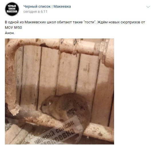 "В одной из Макеевских школ обитают такие "гости". Ждем новых сюрпризов от МОУ №50 Анон", "Обычная школьная раздевалка, батареи есть на том и спасибо","А кроме мышки все норм? Стена, пол, батарея", "Это не гости, это коренные жители", - пишут жители Макеевки в комментариях.