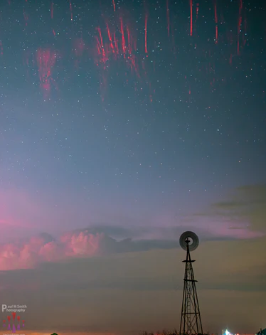 Американский фотограф и метеоролог Пол Смит сфотографировал необычайно редкое погодное явление – большую и яркую вспышку красного спрайта, размер которой в диаметре достигал около 65 км. Вспышка возникла в верхних слоях атмосферы во время интенсивной грозы над югом США, а длилась она лишь несколько миллисекунд.