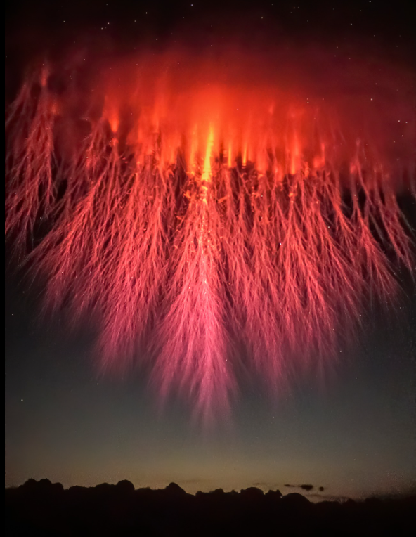 Как пояснил в своем блоге метеоролог Игорь Кибальчич, красные спрайты (red sprite) – это огромные, но тусклые электрические вспышки, возникающие непосредственно над активной грозой в верхней атмосфере Земли. Их появление напрямую связано с ударами линейных молний между облаком и земной поверхностью. Спрайты представляют собой вытянутые пятна красного оттенка, которые могут располагаться как по единице, так и группами. Средняя высота возникновения спрайта составляет 50 – 90 км над землей.