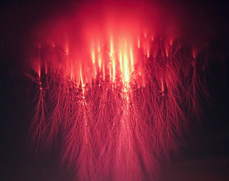 - Медузоподобные – очень большие и яркие вспышки, занимающие объем в атмосфере около 50 х 50 км. Они представляют собой тесную совокупность множества мелких вспышек, объединенных между собой с ярко выраженными "усиками" в нижней части. Именно такой спрайт снял Пол Смит.