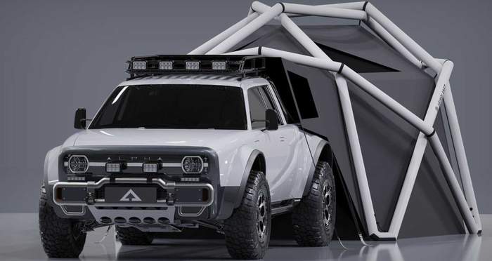 Новый производитель электрокаров Alpha Motor Corporation совместно с производителем туристического снаряжения разработал палатку Cloudbreak, которая размещается в кузове пикапа Alpha Wolf.
