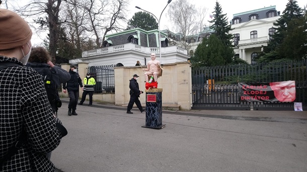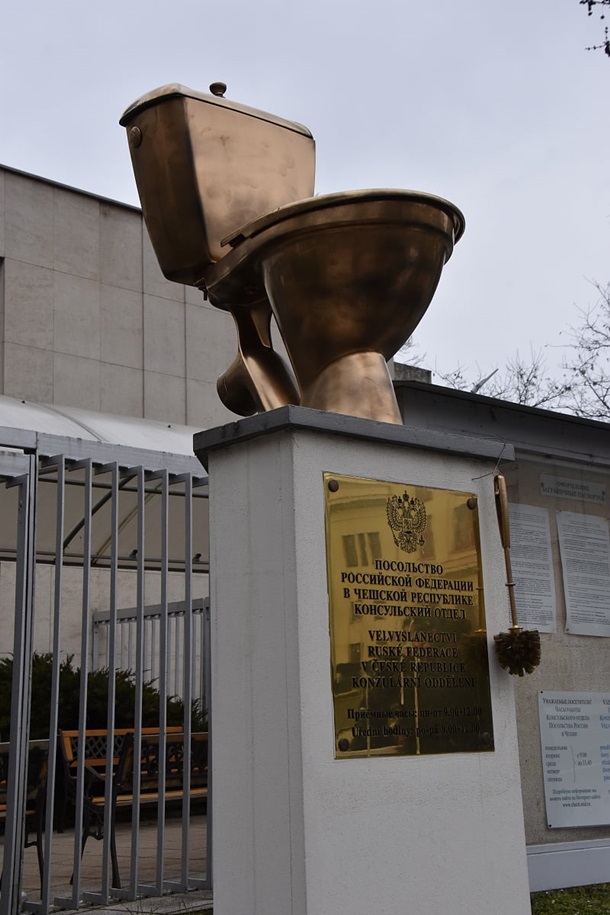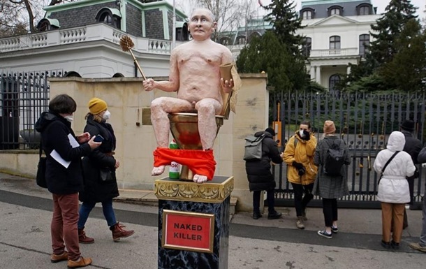 В Праге активисты у посольства России установили статую президента РФ Владимира Путина в обнаженном виде на золотом унитазе и мраморном постаменте.