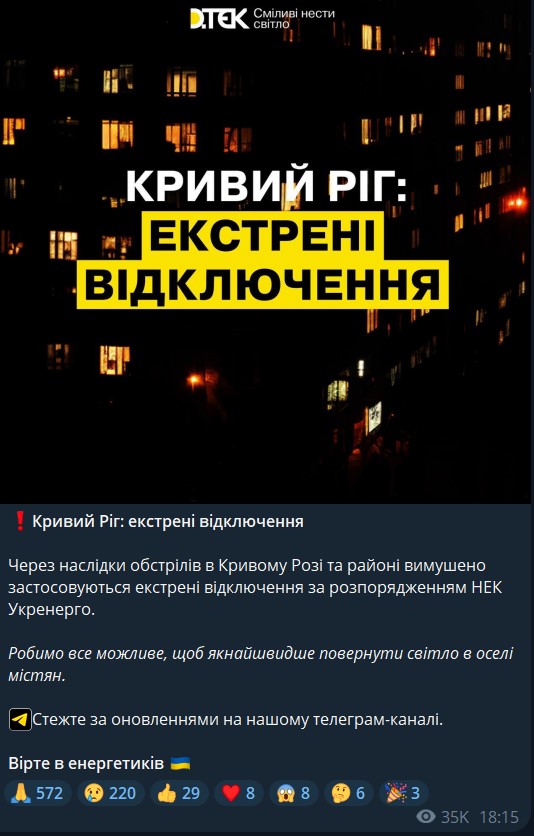 В Кривом Роге и прилегающих районах вводятся экстренные отключения электроснабжения по распоряжению национальной энергетической компании "Укрэнерго".