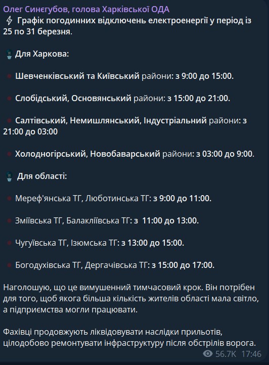 "Отключения электроэнергии в Харьковской области являются вынужденной мерой, которая позволит обеспечить большее количество жителей стабильным электроснабжением и поддержать работу предприятий", – сообщил мер города Олег Синегубов.