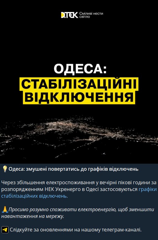 В связи с недавними ударами по объектам критической инфраструктуры в Харьковской области, а также в Одессе и Кривом Роге вводятся графики стабилизационных отключений электроэнергии.