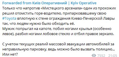 "Только что напротив "Мистецкого арсенала" один из прохожих решил отомстить горе-водителю, припарковавшему свою Toyota вплотную к стене ограждения Киево-Печерской Лавры так, что людям нужно было обходить ее.Мужик попрыгал на капоте, побил ногами крылья (особенно левое), разбил ногами лобовое стекло и отбил правое зеркало", - говорится в сообщении.