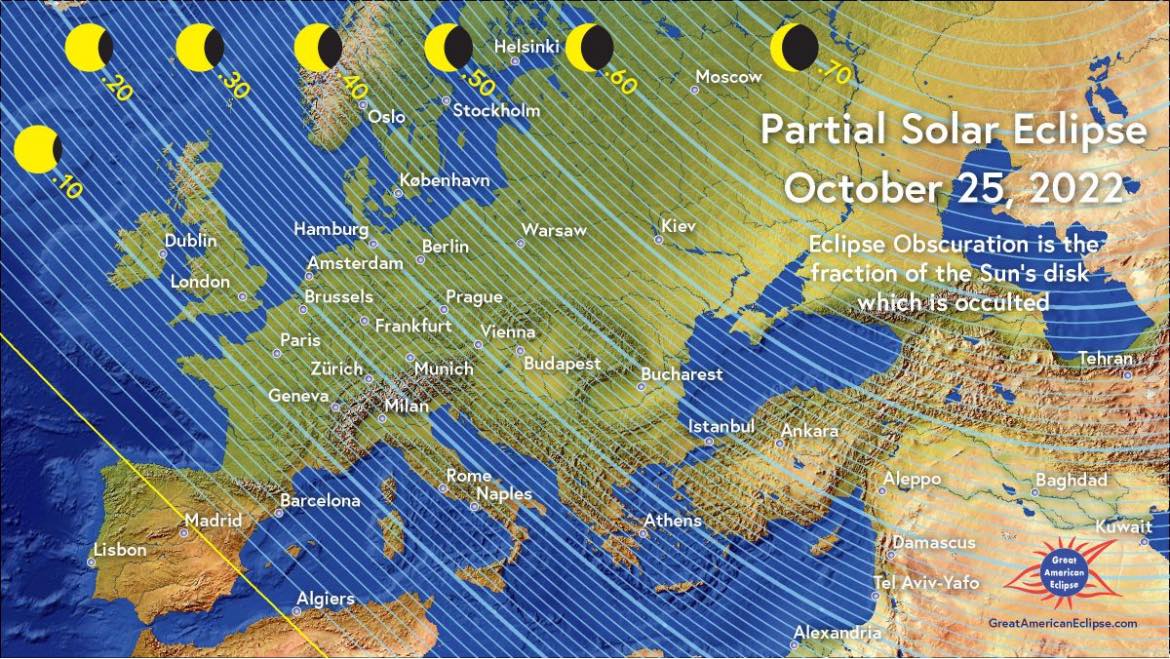 Во вторник, 25 октября, состоится еще одно частичное солнечное затмение, которое увидят на территории северо-востока Северной Америки, запада Евразии, северо-востока Африки, северной части Атлантического океана и юго-западной части Северного Ледовитого океана.