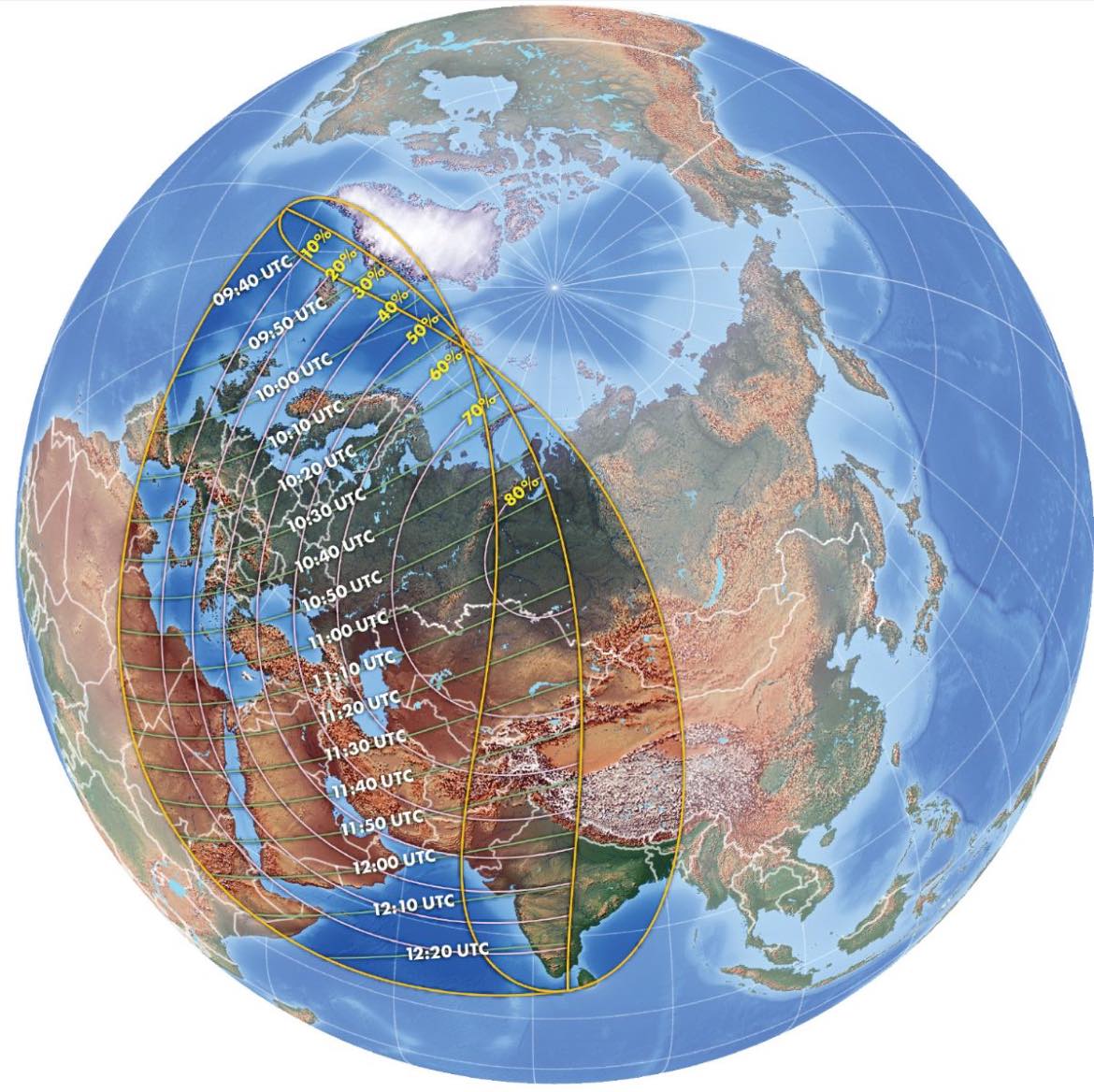 Максимальная интенсивность затемнения в Европе (по местному времени):