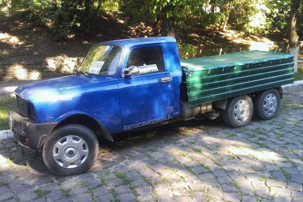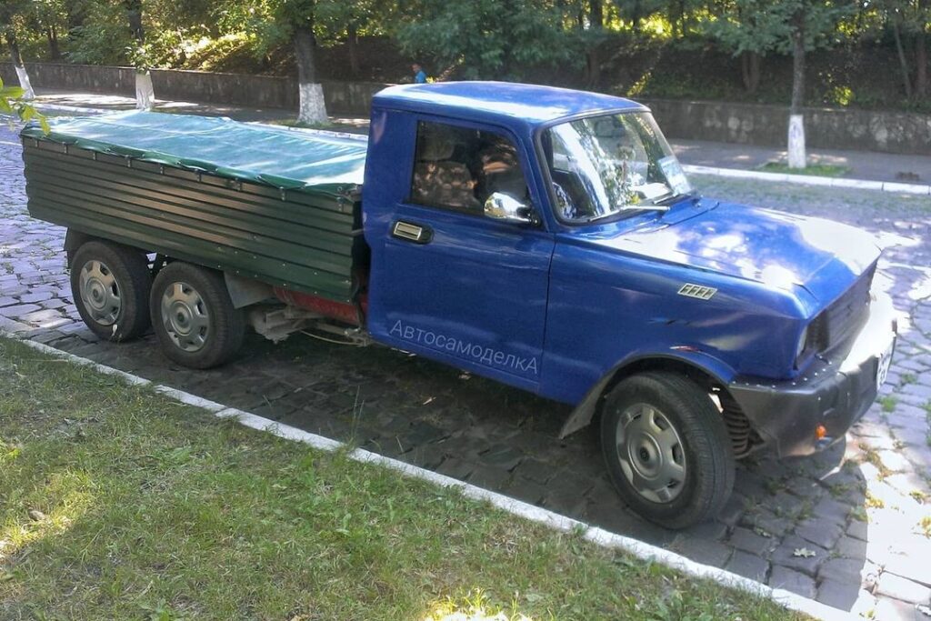Внешне это очень странный Москвич-2140. Фактически, его перекроили в пикап талантливые автомеханики, причем поставили они его на шестиколесную базу.