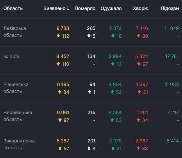 Больше всего новых случаев коронавируса за минувшие сутки обнаружили во Львовской области (+112), г. Киев (+110), в Ровенской области (+84), Черновицкой области (+97), Закарпатской области (+57).