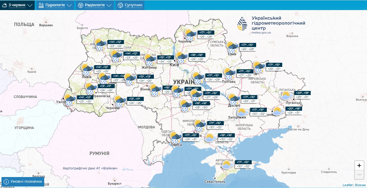 В воскресенье, 2 июня, облачно с прояснениями. Дожди умеренной интенсивности в западных, центральных и северных областях Украины. Температура ночью от +16 до + 18 градусов, днем от +26 до + 28 градусов.