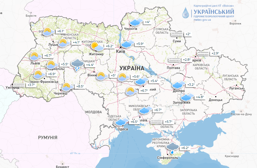 В воскресенье, 4 февраля, в Украине небольшие осадки, порывы ветра до 20 м/с, температура днем 3-8° с отметкой плюс.