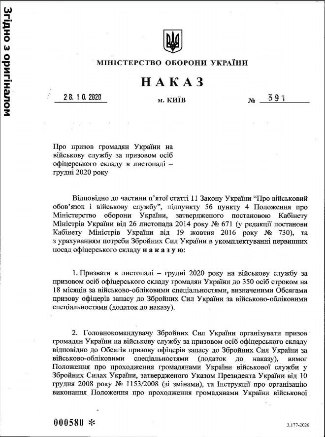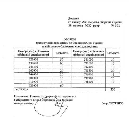 В 2020 году в ноябре и декабре на военную службу в Вооруженных силах Украины призовут 350 офицеров запаса, которые окончили военные кафедры, но еще не проходили службу.