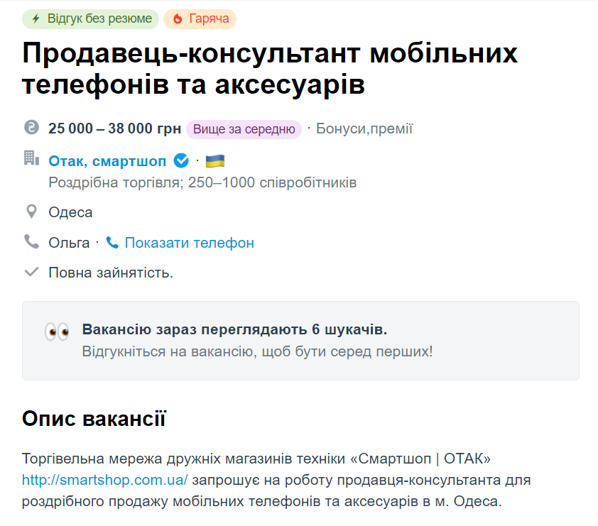 Так, в Одессе ищут продавца-консультанта мобильных телефонов. В обязанности работника будет входить консультирование посетителей магазина, а также продажа товаров и услуг компании. Чтобы занять соответствующую должность, нужно быть коммуникабельным и иметь желание развиваться. При этом опыт работы не обязателен.