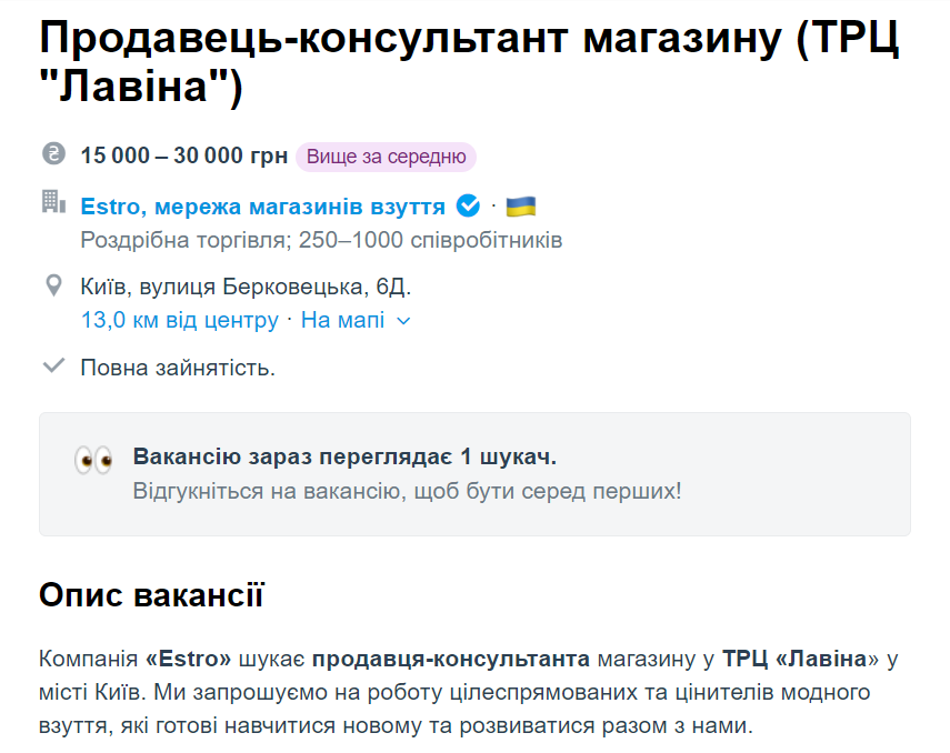 Работодатель предлагает оплачиваемую стажировку, график 4/2, развитие и обучение на средства компании и широкие возможности для профессионального и карьерного роста. Обещают конкурентоспособную зарплату – до 38 тысяч гривен.