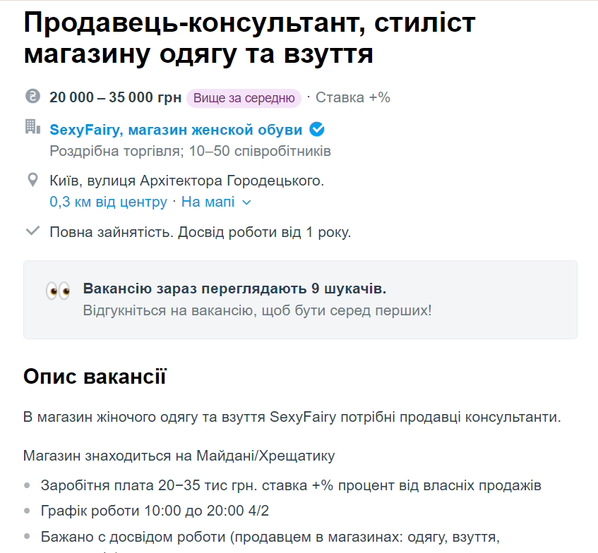 Стилист магазина одежды и обуви в Киеве также может неплохо зарабатывать. Именно такого человека ищут в столице магазин женской обуви. Работодатель обещает график 4/2 с 10:00 до 20:00, официальное трудоустройство, дружеский коллектив и возможность карьерного роста. Ищут кандидата желательно с опытом работы, а зарплата может колебаться от 20 до 35 тысяч гривен.