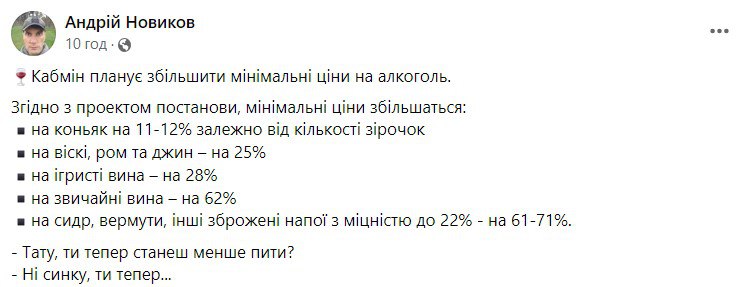 Правительство хочет повысить минимальные цены на алкоголь, на который водителей будут проверять по-новому, от 11 до 71%, в зависимости от крепости и вида алкогольного напитка. В сети это вызвало у украинцев бурные эмоции.