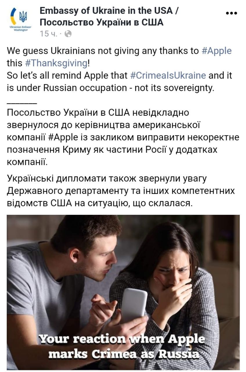 "Считаем, что украинцы не будут благодарить Apple на этот День благодарения. Поэтому, напомним Apple, Крым - это Украина, и он находится под российской оккупацией, а не ее суверенитетом", - говорится в заметке.