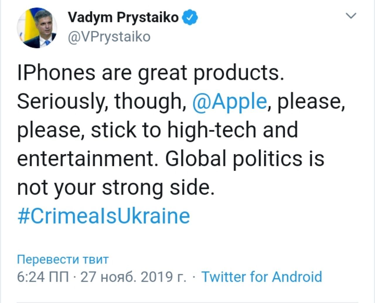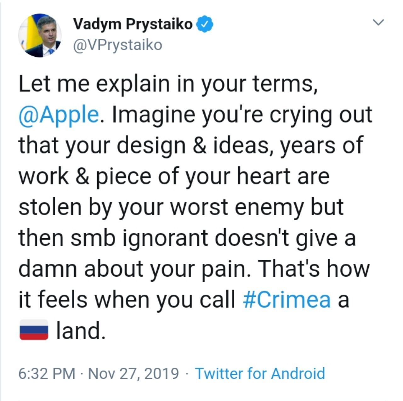 "IPhones - отличные продукты. Если серьезно, Apple, пожалуйста, пожалуйста, сосредоточьтесь на высоких технологиях и развлечениях. Глобальная политика - не ваша сильная сторона. Apple, представьте, как вы кричите, что ваш дизайн и идеи, годы работы, и часть вашего сердца украденны вашим злейшим врагом, а кого-то равнодушного совсем не затрагивает вашу боль. Вот какие ощущения бывают, когда вы называете Крым российской землей ", - написал Пристайко.