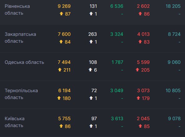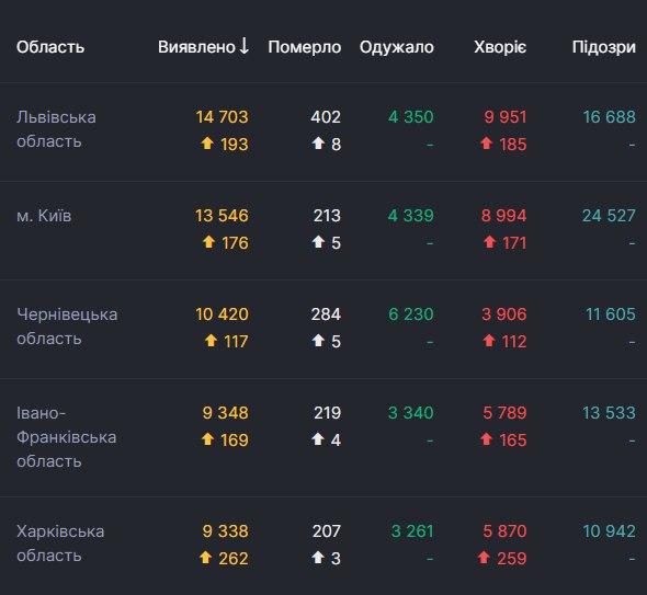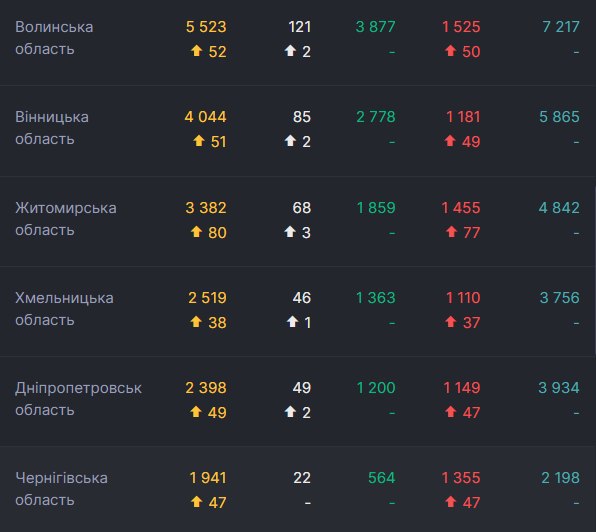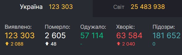 Всего с начала пандемии коронавирусом заболели 123 303 человека. За все время умерли - 2 605 пациентов. Но сумели побороть болезнь 57 114 украинцев.