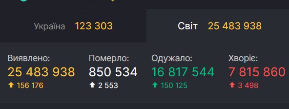 В мире заболели более 25 миллионов людей. Умерли от болезни - 850 534. Но выздоровели - более 16,5 миллиона человек.