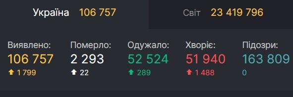 В Украине за минувшие сутки подтверждено 1 799 новых случаев заболевания COVID-19. Всего по состоянию на утро понедельника, 24 августа, в стране выявлено 106 757 заболевших коронавирусной инфекцией.