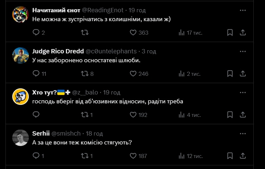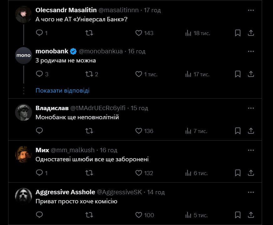 В комментариях под твитом пользователи Х написали свои версии, почему произошел досадный отказ. В частности, говорили об уже существующей связи monobank с "Универсал Банком", о недостаточно зрелом возрасте monobank. Также шутили об однополых браках, которые в Украине еще не разрешены.