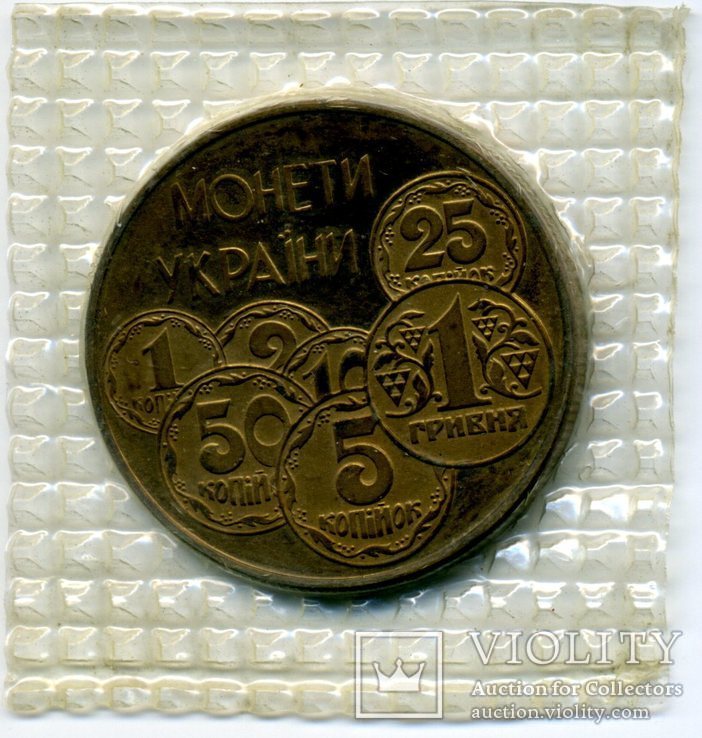 Внешне монета отличается от тех, что находятся в обиходе украинцев сейчас. Она изготовлена из латуни, на ней изображены другие монеты разного номинала (1, 2, 5, 25, 50 копеек и 1 гривна).