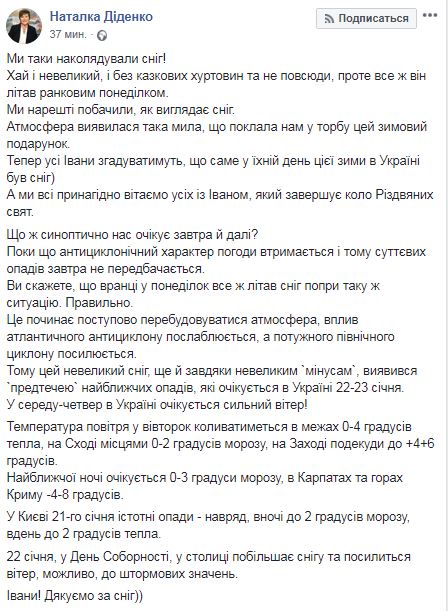 "Пока антициклонный характер погоды удержится и поэтому осадков завтра не предвидится. Вы скажете, что утром в понедельник все же летал снег несмотря на такую же ситуацию. Правильно. Это начинает постепенно перестраиваться атмосфера, влияние атлантического антициклона ослабевает, а мощного северного циклона усиливается. Поэтому этот небольшой снег, еще и благодаря небольшим "минусам", оказался "предтечей" ближайших осадков, которые ожидаются в Украине 22-23 января", - написала она.