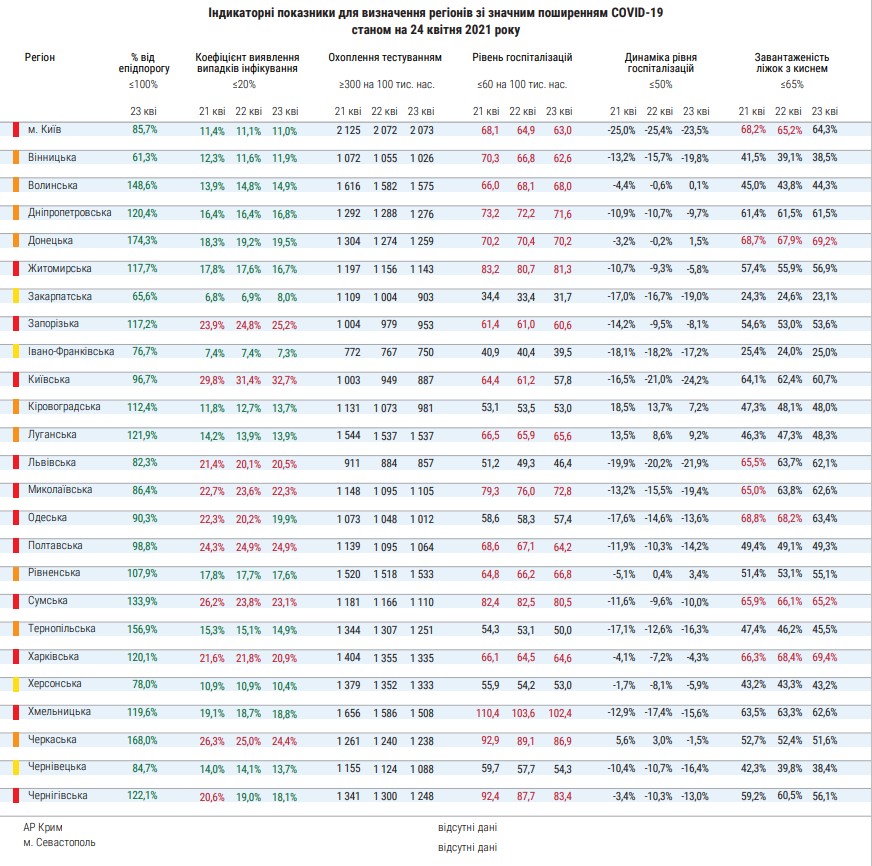 По состоянию на 24 апреля в "красной зоне" находятся 12 регионов: