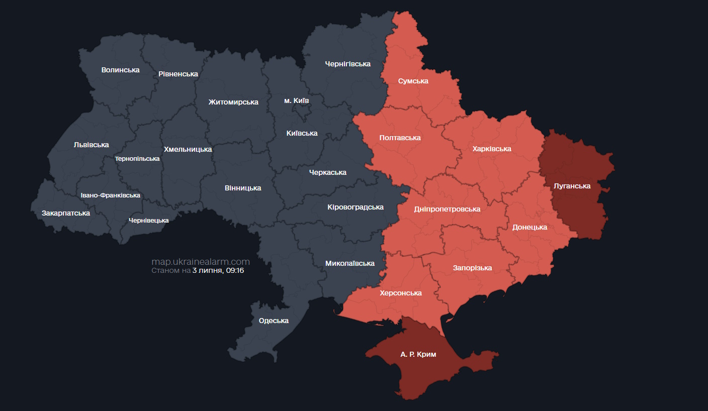 В понедельник, 3 июля, Россия обстреляла Украину ракетами и БПЛА, однако утром в стране вновь объявили воздушную тревогу.