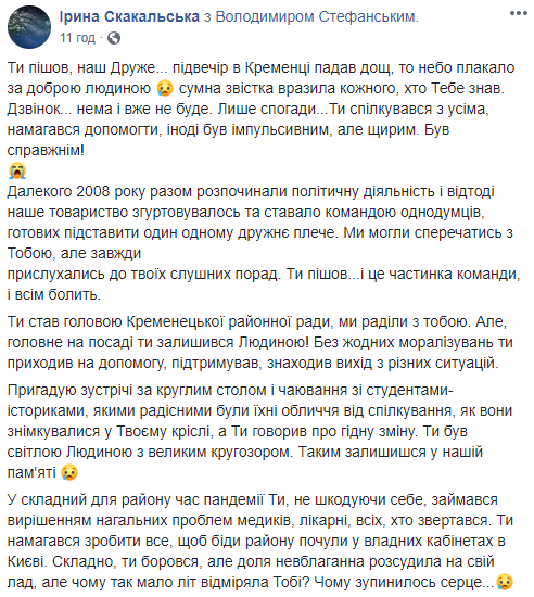 Коллега Стефанского Ирина Скакальская написала в Facebook, что на должности главы Кременецкого райсовета Владимир активно занимался решением насущных проблем медиков.