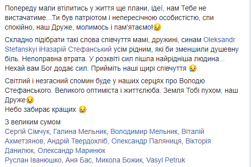 "Впереди было воплощение в жизнь планов, идей…Нам тебя не хватает ... Ты был патриотом и незаурядной личностью, спи спокойно, наш друг, молимся и помним!" – сообщила она.