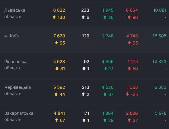 За сутки больше всего новых случаев зафиксировали во Львовской (130) и Ровенской (81) областях, а также в городе Киеве (95).