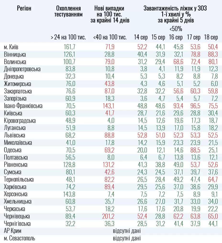 Вместе с тем, в Винницкой, Волынской, Закарпатской, Ивано-Франковской, Львовской, Одесской, Ровенской, Тернопольской и Черновицкой областях и Киеве превышены допустимые значения показателей загруженности больниц первой волны за последние 5 дней.