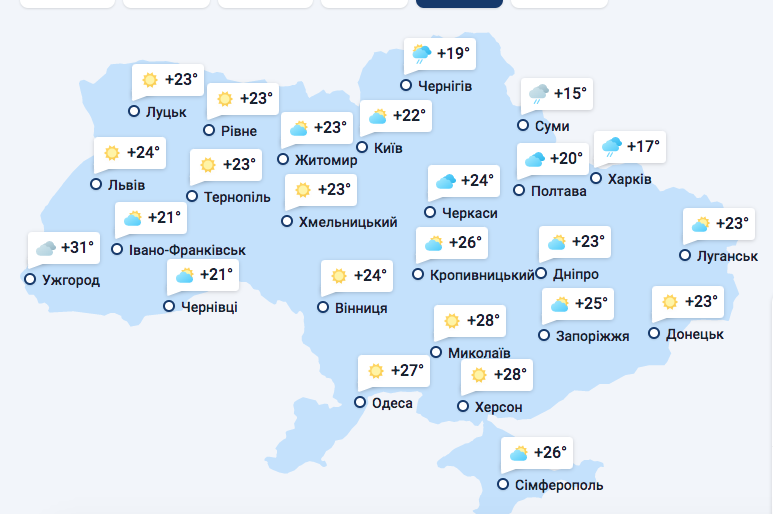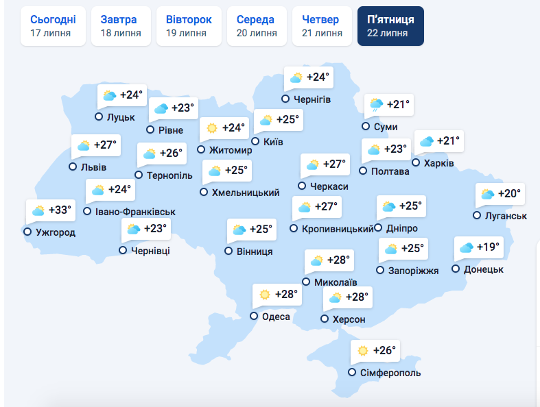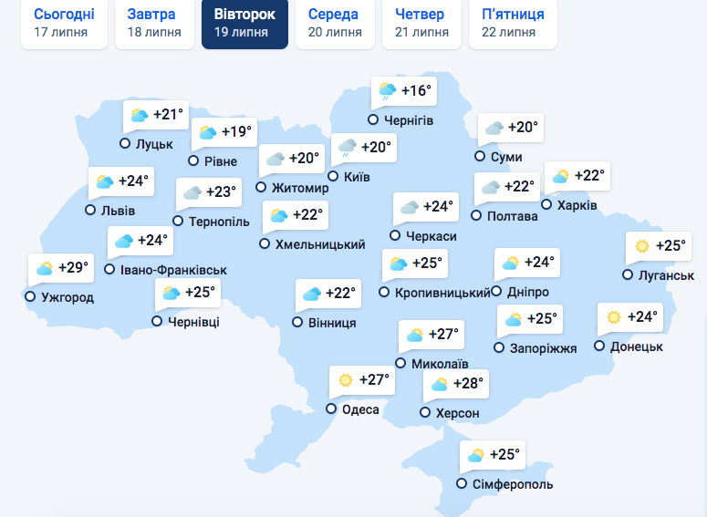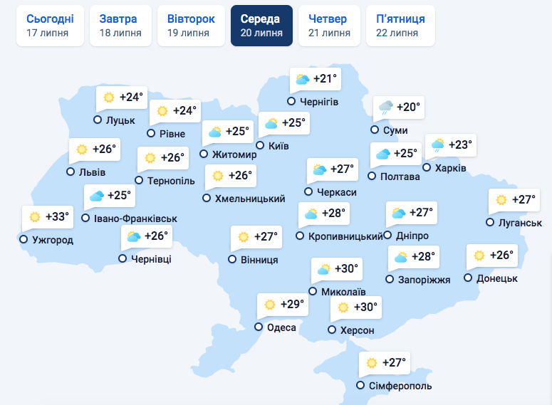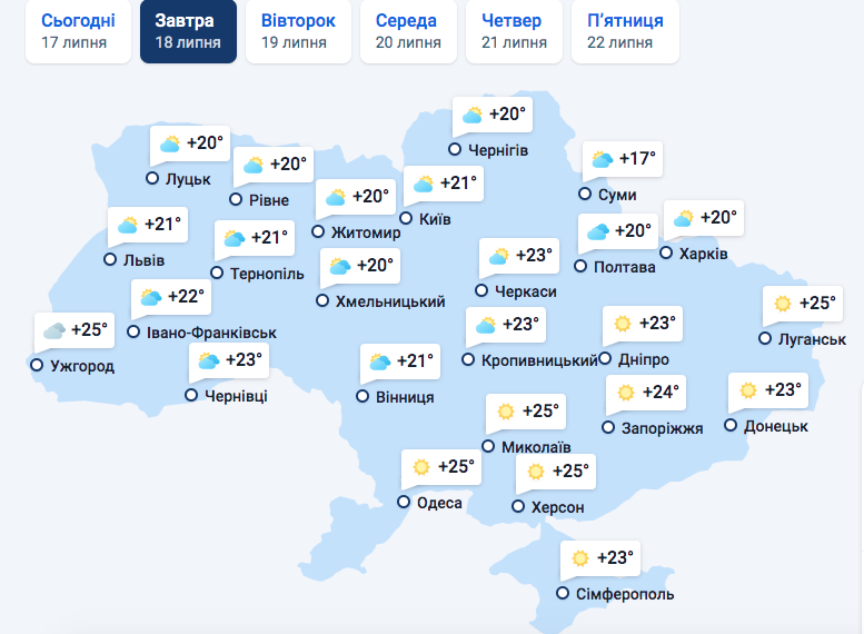В четверг, 21 июля, в Ужгород уже придет сильная облачность, а температурного "аутсайдеса" этой недели, Чернигов, ждут дожди. Холоднее всего в Суммах, где днем будет всего 15 градусов со знаком "поюс". В Харькове будет всего 17, а на Юге и в Крыму средняя температура воздуха днем составит 27 градусов.