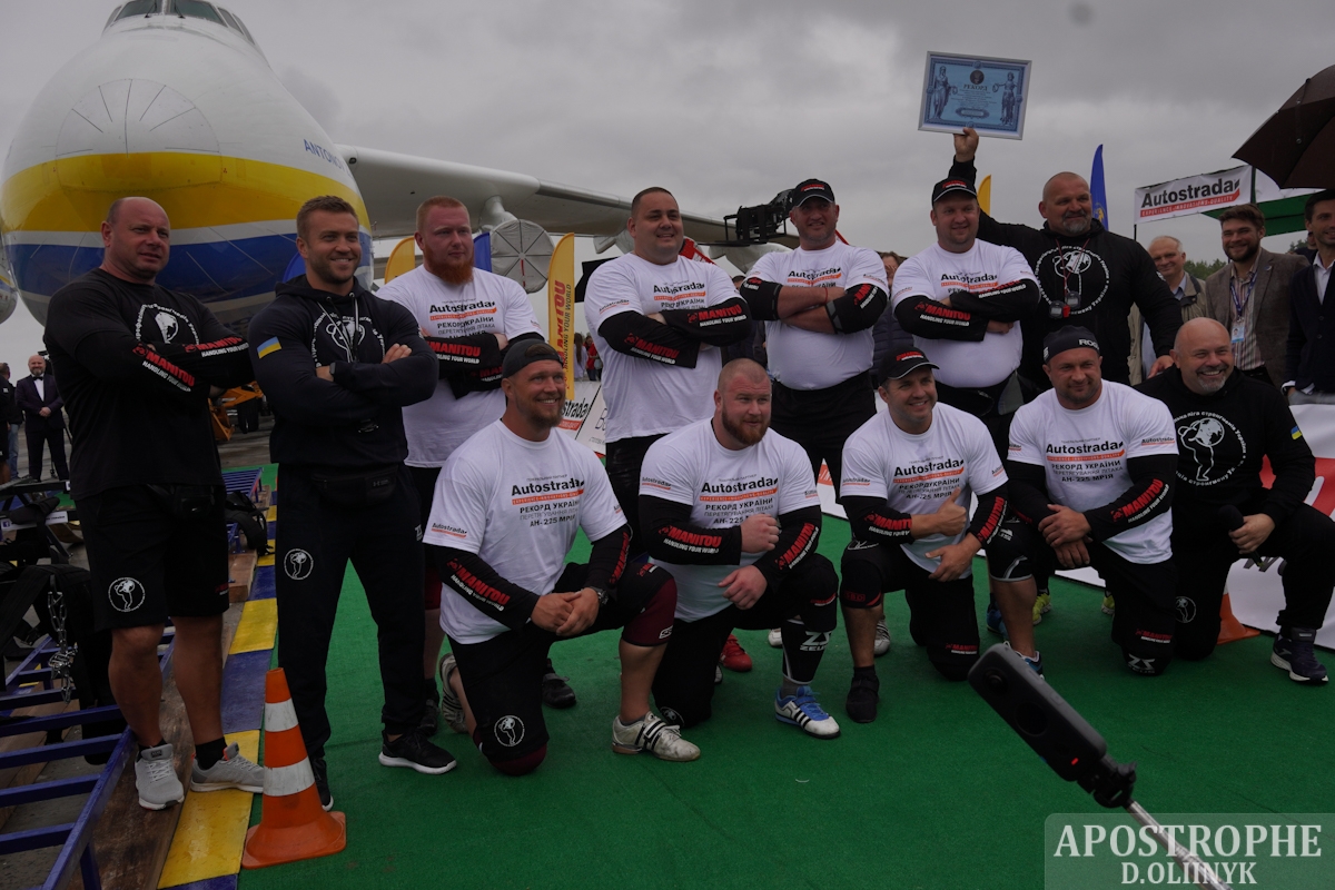 Спортсмены протащили самолет 4 метра 30 см за 1 минуту 13 секунд. Вес самолета - 330 тонн (с горючим). Ранее этот рекорд уже был побит, но в тот раз самолет тащили 10 спортсменов. В Украине участвовали 8 атлетов и каждый из них взял на себя примерно по 42 тонны.