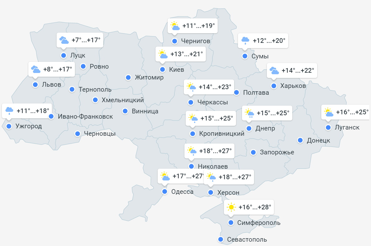 В Винницкой области будет облачная погода, без осадков. Температура воздуха ночью +8...+11 °С, днем +18...+21°С. В Днепропетровской области будет пасмурная погода, дождь. Температура воздуха ночью +12...+15°С, днем +20...+25°С.