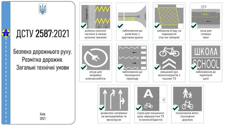 Новый стандарт "Безопасность дорожного движения. Разметка дорожная. Общие технические условия" разработан специалистами ГП "ГосдорНИИ". Таким образом эта разметка заменит действующую ДСТУ 2010 года в соответствии с приказом Национального органа стандартизации.