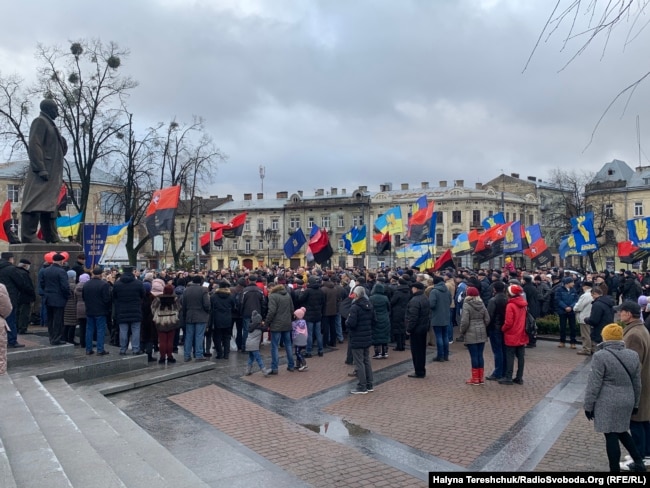Около пол тысячи львовян пришли под памятник Степану Бандере. Участие в мероприятии приняли представители местных властей, депутаты разных уровней, общественные активисты, участники боевых действий на Донбассе.