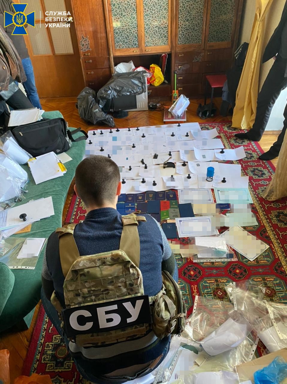 Во время обысков по адресам проживания организатора группировки Северодонецке, а также в подпольной лаборатории в Харькове, правоохранители обнаружили: оборудование для изготовления фальшивых документов и большое количество поддельных паспортов.