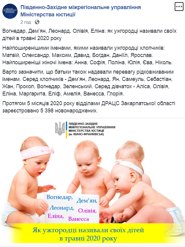 Как отмечается, в мае 2020 года самыми популярными у ужгородцев имен были Вогнедар, Демьян, Леонард, Оливия, Элина.