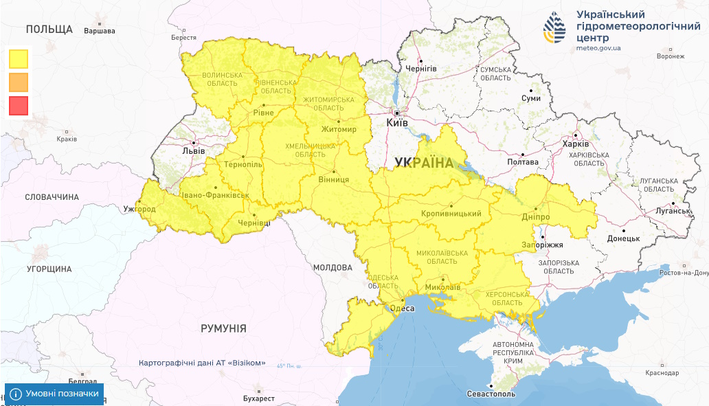В то же время Укргидрометцентр опубликовал карту погодных условий на 24 мая. Желтым цветом обозначены области, где погодные условия ухудшились. Это Волынская, Ровенская, Житомирская, Хмельницкая, Винницкая, Закарпатская, Ивано-Франковская, Тернопольская, Черновицкая, Черкасская, Кировоградская, Николаевская, Одесская, Херсонская и Днепропетровская.