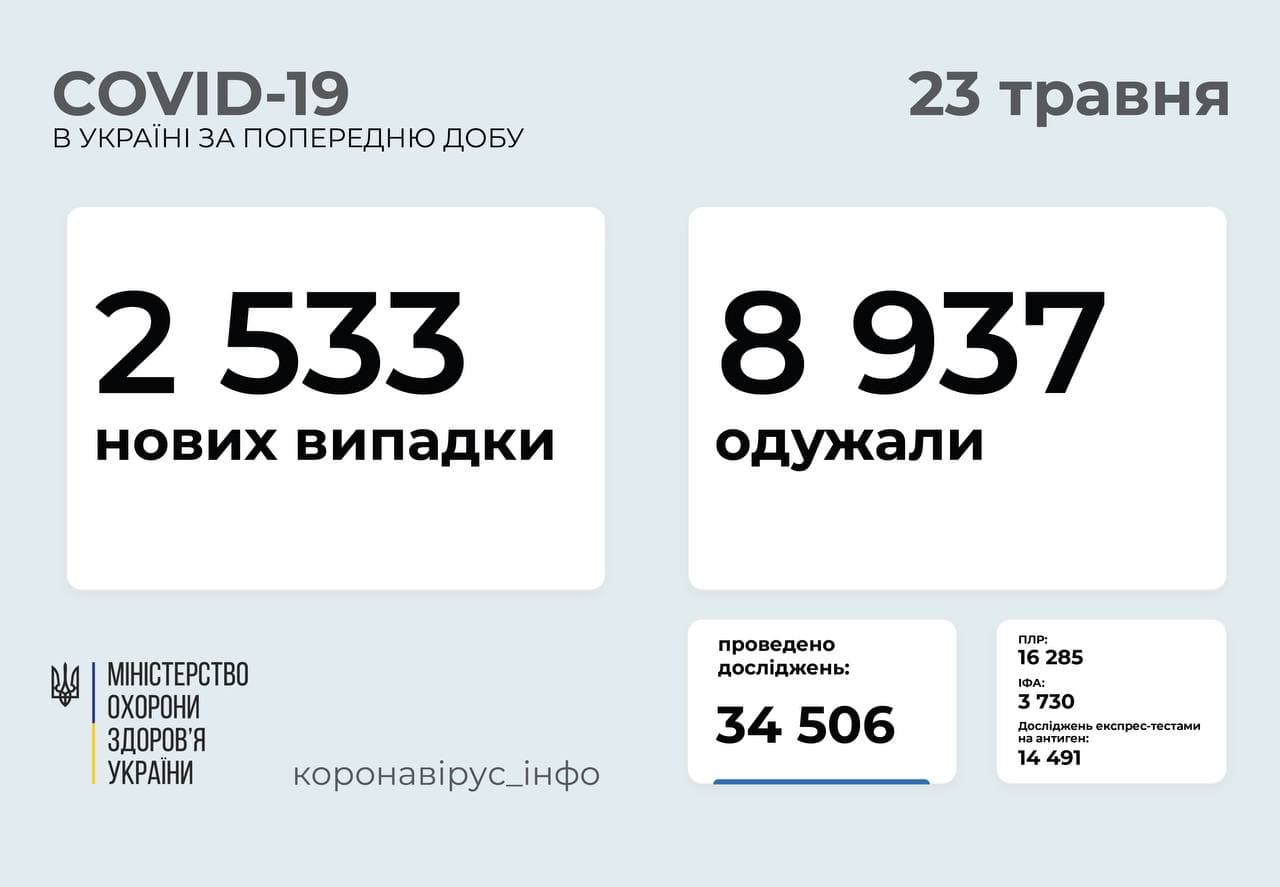 В Украине за минувшие сутки, 22 мая, зафиксировано 2 533 новых случая коронавируса, заболели в том числе 153 ребенка и 31 медработник.