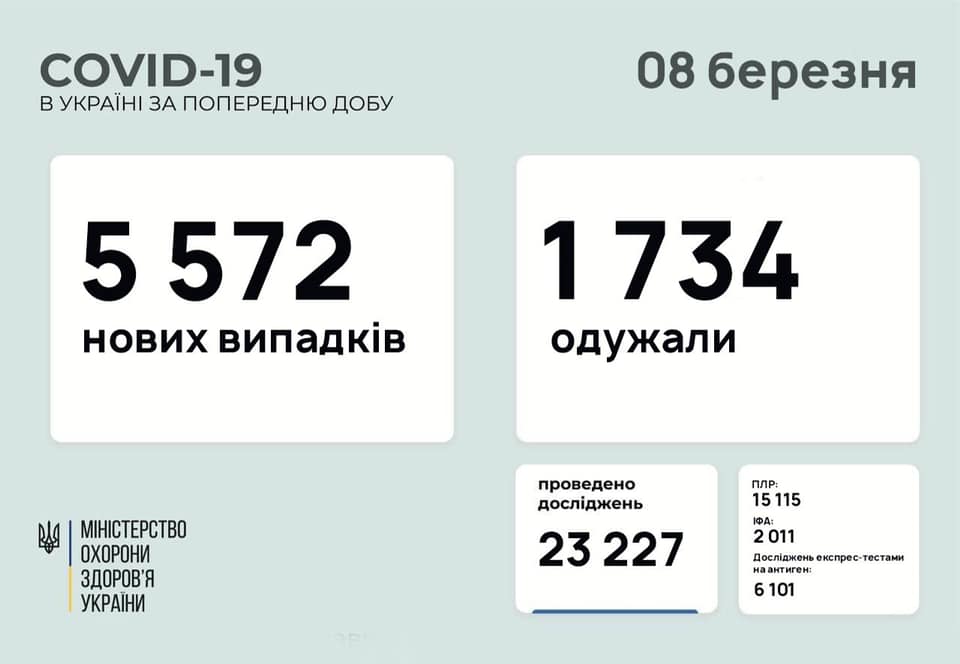 В Украине за минувшие сутки, 7 марта, зафиксировано 5 572 новых случая коронавируса.