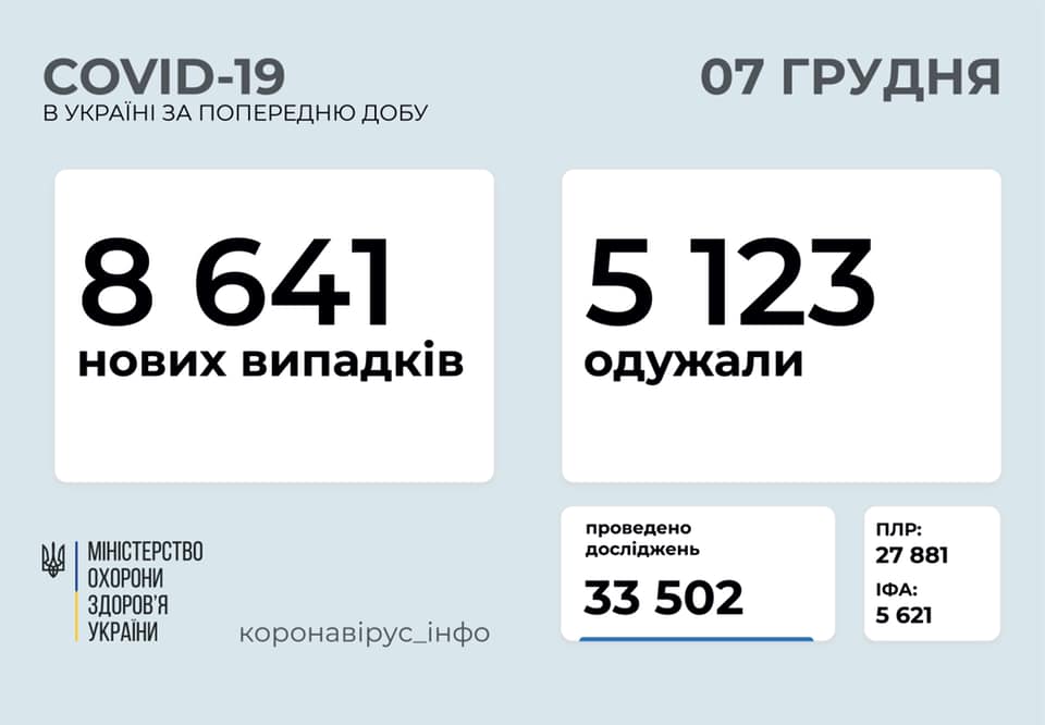 В Украине за минувшие сутки, 6 декабря, зафиксировали 8 641 новый случай коронавируса.