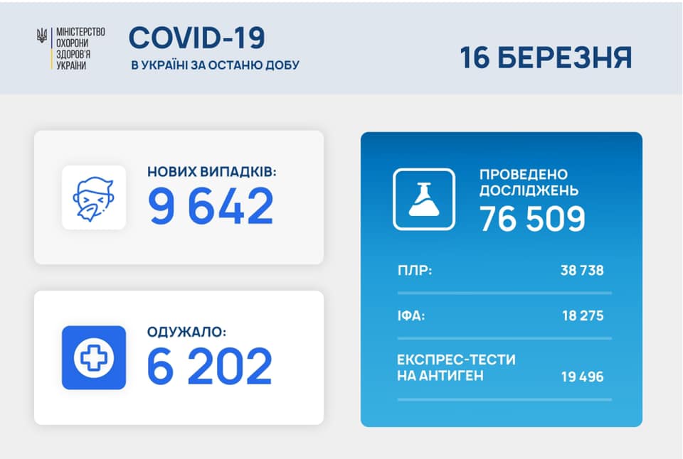 В Украине за минувшие сутки, 15 марта, зафиксировано 9 642 новых случая коронавируса.