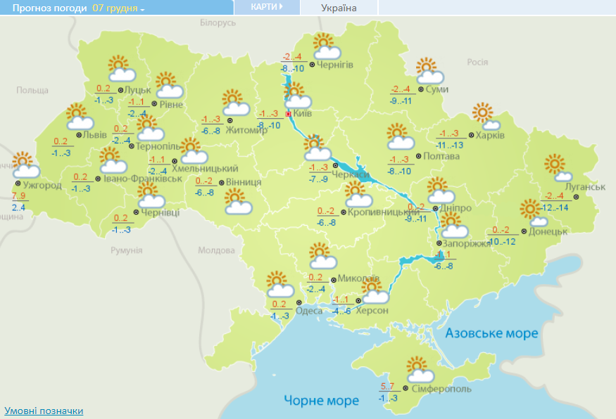 В Укргидрометцентре уточнили, что 7 декабря холоднее всего будет на востоке страны - там ночью ожидается -12-14 градусов мороза.